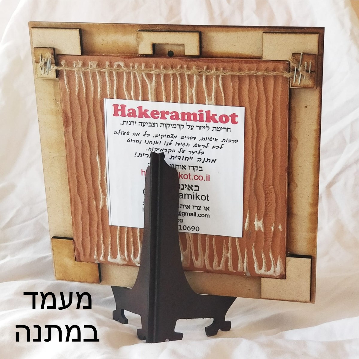התמונה עשויה מקרמיקה עם מסגרת מעץ איכותי ובשלושה גדלים שונים:19 על 19 ס"מ,25 על 25 ס"מ.המסגרת מגיעה בשישה צבעים שונים.אנחנו חורטים בלייזר על הקרמיקה,צובעים בצבעי אקריליק מיוחדים,ומכניסים לתנור לשעה (כמו עוגה...),כך שהצבע לא יורד. ניתן לתלות על הקיר (יש מתלה מאחורה),לשים על סטנד קטן (כלול בקניה ללא תוספת תשלום) או להשתמש בזה בתור תחתית לסיר חם. מתנה מקורית לאירועים מיוחדים ולאנשים מיוחדים. ניתן להזמין דברים אישיים.כל מה שעולה לכם לראש.